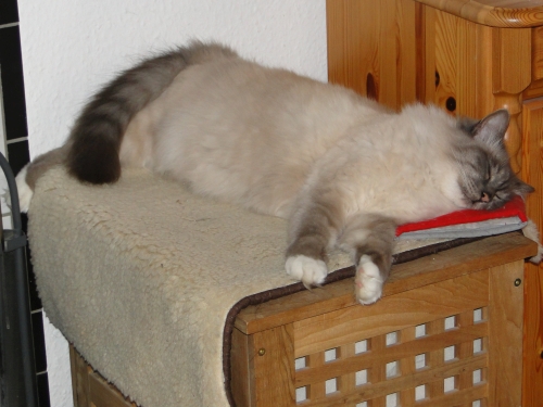 Er schläft im Kratzbaum ganz oben und bekommt natürlich immer als Erster Futter.
